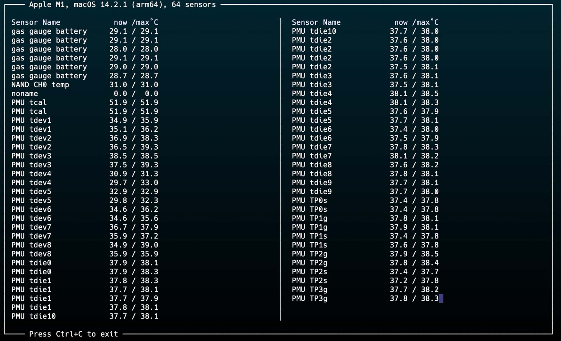 Hier in aller Kürze der Trick, wie man unter MacOS Sonoma auf Apple Silicon-Macs (M1/M2/M3-Serie) auslesen kann - denn altbekannte Werkzeuge wie "osx-cpu-temp" und das hauseigene Werkzeug "powermetrics" liefern keine Temperatur-Messwerte auf den neueren Apple-Eigenen Chips.