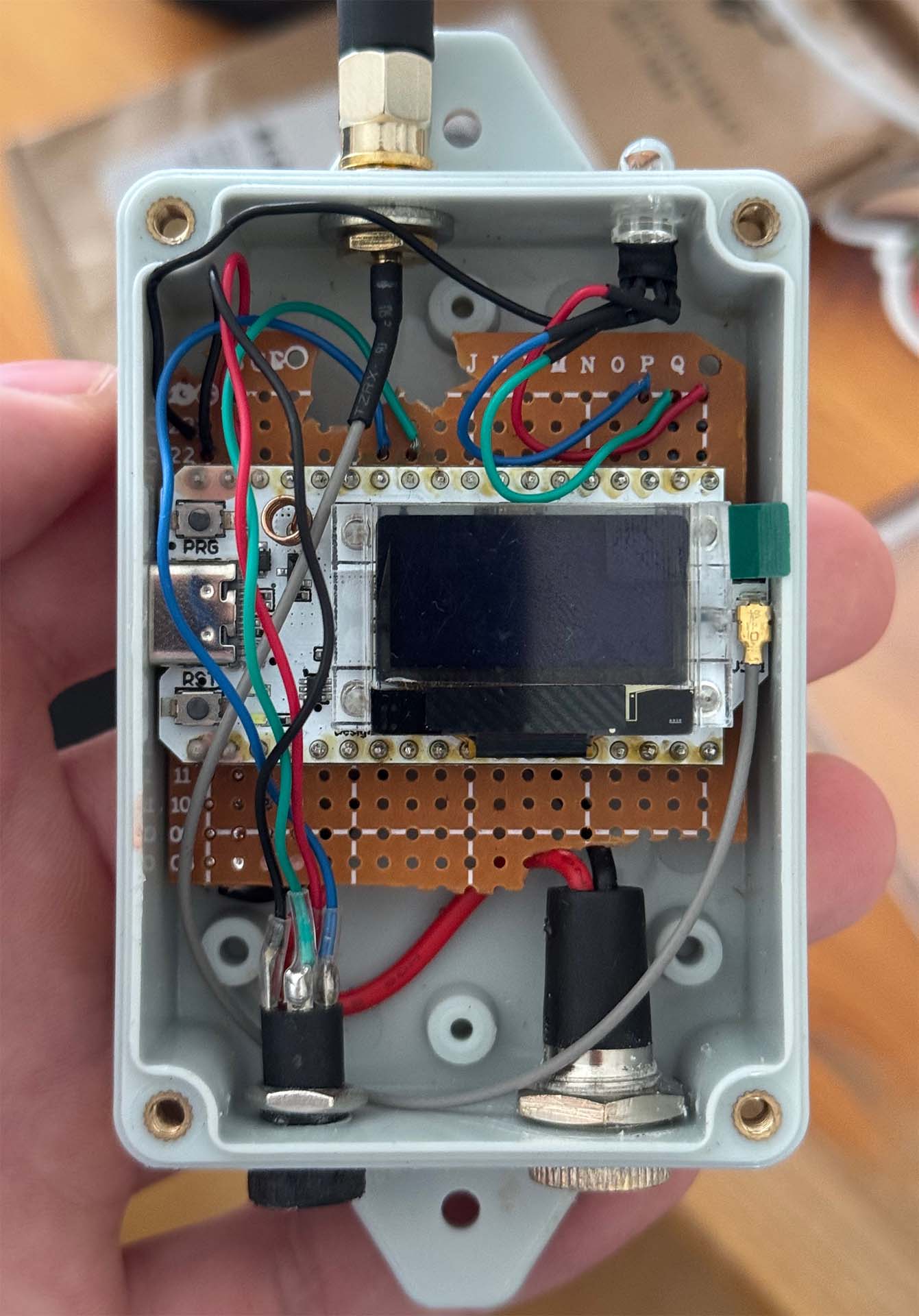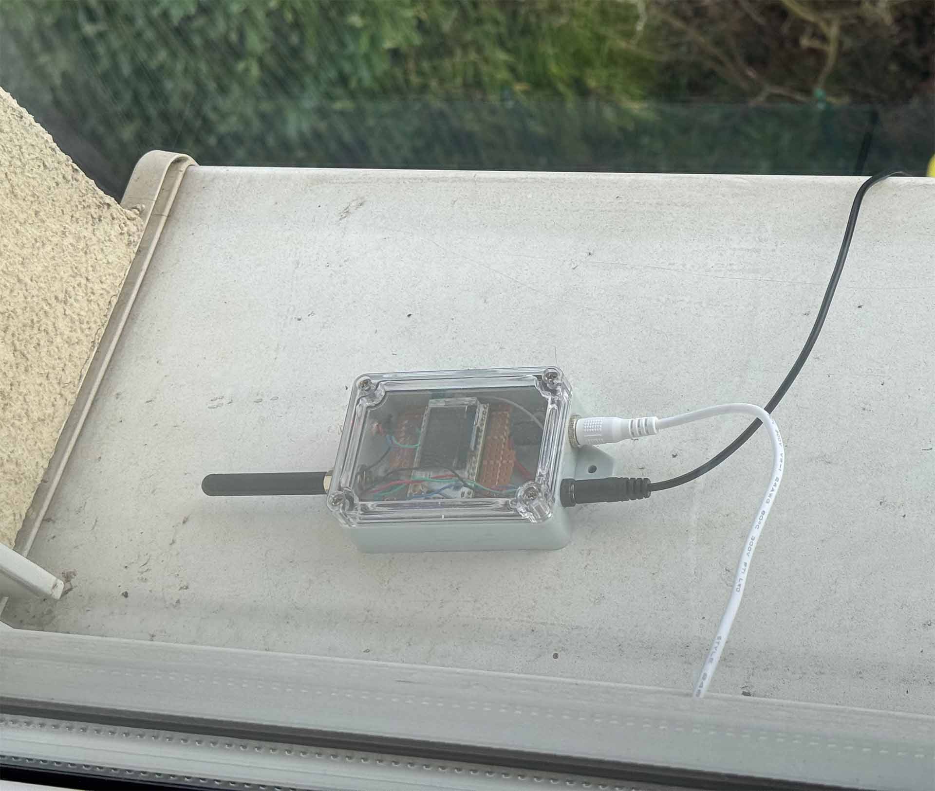 Die Hardware könnte in diesem Projekt nicht einfacher ausfallen: Ein ESP32-Basierter LORAWAN-Funkender Microcontroller in einem wasserdichten Gehäuse abgeschirmt von den Elementen, mit einer durch das Gehäuse geführte 868 Mhz-Antenne und einem Anschluss für einen Sensor. Der Microcontroller wurde von mir auf einer Lochplatine aufgelötet, alle stromtragenden Traces wurden mit Nagellack vor kriechender Feuchtigkeit abgeschirmt.