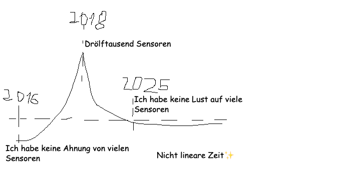 Meine Umweltmesstationen im Überblick: Früher keine Ahnung gehabt, dann alles an einen armen Arduino geklatscht, jetzt wird ein Sensor für alles verwendet (tolle Zeichnung von https://jspaint.app)