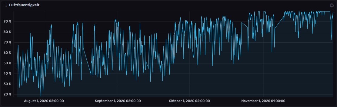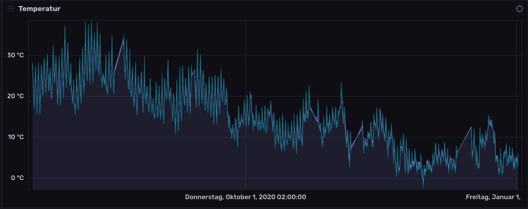 Softwareseitig wird es Zeit, sich mit sogenanntem Downsampling zu beschäftigen, 50-70 GB Rohdaten pro Jahr sind viel zu viel. Im Moment haben alle Datenpunkte eine Auflösung von circa 5 Minuten pro geschriebenem Messpunkt (in der Sensoreinheit werden die Sensoren alle 90 Sekunden ausgelesen, geschrieben wird dann der Mittelwert), für die Langzeittrendanalyse will ich die Datensätze auf 60 Minuten/Datenpunkt runterbrechen. Damit will ich meinem Ziel von 10 GB/Jahr etwas näher kommen, außerdem sinkt die benötigte Rechenleistung mit kleineren Datensätzen erheblich.