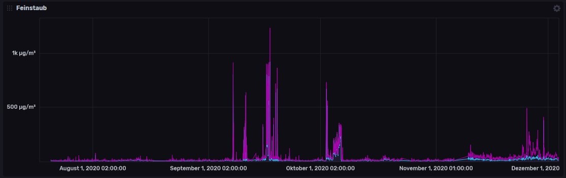 Besonders interessant fand ich die Messergebnisse der Messstation 1, insbesondere der Temperatur- und Luftfeuchtigkeitsmessungen: Ein klarer Trend ist mit den Jahreszeiten zu erkennen, zudem kann ich bei diesen Sensoren mit hoher Sicherheit die Datenkorrektheit überprüfen: Beim Luftqualitätssensor des Types MQ-135 kann ich bisher noch nicht die Temperaturabhängigkeit endgültig bestimmen, da der Sensortyp mit einem Heizdraht zur Luftqualitätsbestimmung arbeitet, liegt es nah, dass eine niedrigere Temperatur zu anderen Messungen kommt als mit sehr warmer Luft. Deshalb arbeite ich grade daran, eine Funktion zum Ausgleichen dieser Temperaturschwankungen zu schreiben. Ähnlich wird auch der Feinstaubsensor beeinflusst, denn dank der Messmethode über Laserstahlen innerhalb des Gerätes wird auch Nebel fälschlicherweise als Feinstaub gewertet. Es gab letztes Jahr nur einmal wirklich Nebel, dort sieht man dann in den Daten einen starken Ausschlag: