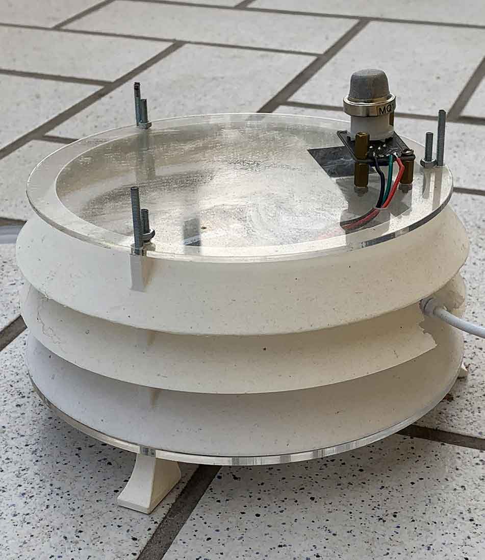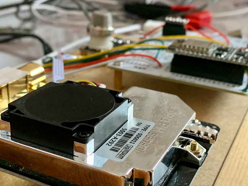 Die Innenraummesstation ist besonders für die Luftqualität interessant, denn daraus können Lüftungsempfehlungen abgeleitet werden. Diese Messstation hat wieder zweimal Feinstaubsensoren, zwei mal Lufttemperatur, einmal Luftdruck und Luftqualität sowie einmal einen NDIR-CO2-Sensor des Types "MH-Z14A". Besonders die Werte dieses Sensors sind besonders interessant für die Lüftungsempfehlungen.