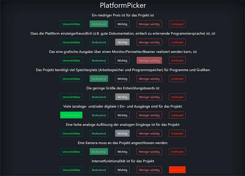 Die Bedinung des Tools gestalltet sich wie folgt: Nachdem man die Sprache ausgewählt hat, wird man zur Fragenseite weitergeleitet, bei der man bei 13 Fragen Stellung beziehen kann. Nach dem Bestätigen der Ergebnisse wird man automatisch auf eine der 16 unterseiten weitergeleitet, die alle unterschiedliche Microcontroller- oder Microprozessorboards beleuchten.