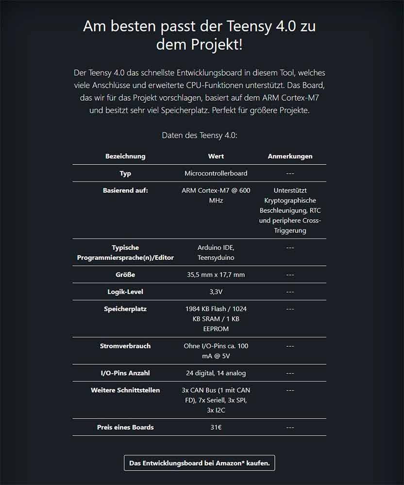 Die Detailseiten selber haben dann eine Kurzbeschreibung der (laut Tool) passendsten Plattform, dazu noch eine Tabelle mit den Eigenschaften des Boards. Die Tabelle beinhaltet unter anderem den Chip der Plattform, die Anzahl der I/O-Pins und Tipps, welche Programmiersprachen am häufigsten verwendet werden.